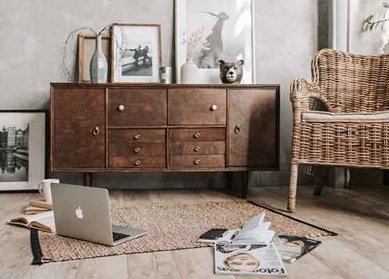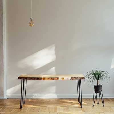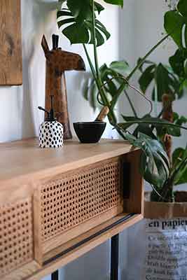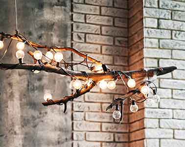 원목, 라탄 rattan, 순면 등 자연 소재 가구, 램프 등을 선택합니다. 가공되지 않은 나무를 테이블로 사용하거나 나뭇가지에 전구를 달아 램프로 사용할 수도 있습니다.